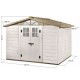 Ausgestattet mit 22mm dicken, hohlen PVC-Wänden, 2 Glastüren mit Metallschloss, ist dieser Garten mit Holzplattenboden aus Verbundplatten und uv-behandeltes ABS-Dach mit 2 Nachahmungen von Dachziegeln aus dem Evo-Bereich der beigefarbenen Farbe.