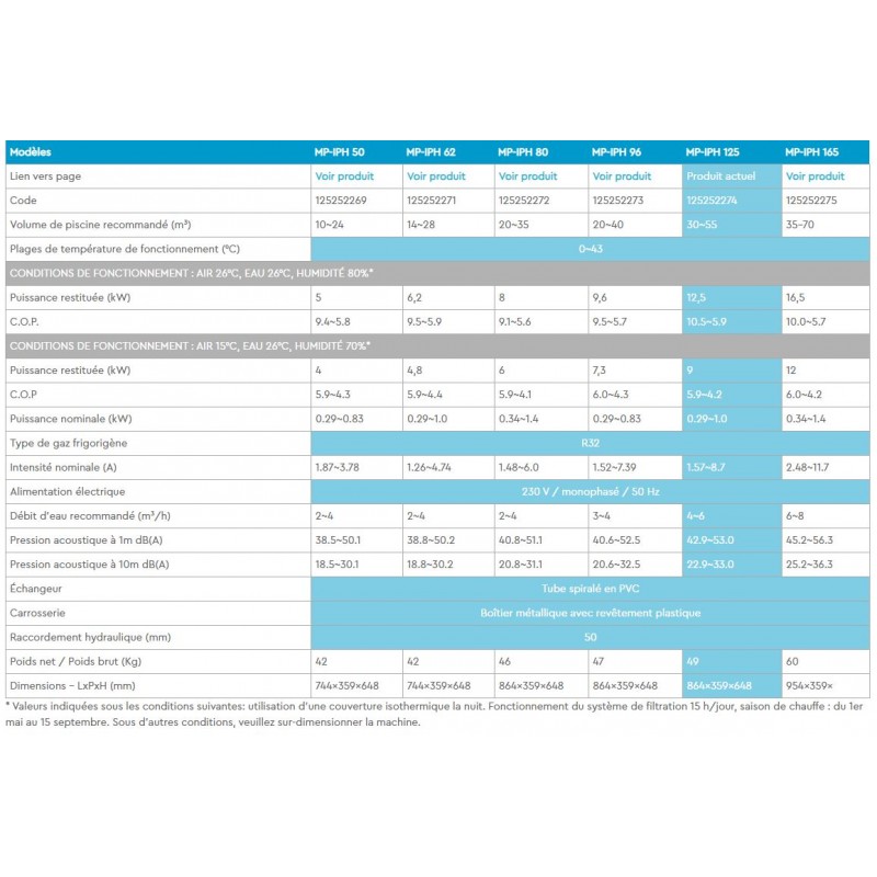 Values indicated under the following conditions: use of an insulated blanket at night. 3 p.m./day filtration system, heating season: May 1 to September 15. Under other conditions, please over-size the machine.