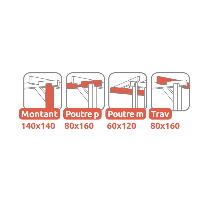 The 6 x 12cm wall rear beam and the roof crossbars measure 8 x 16 cm.