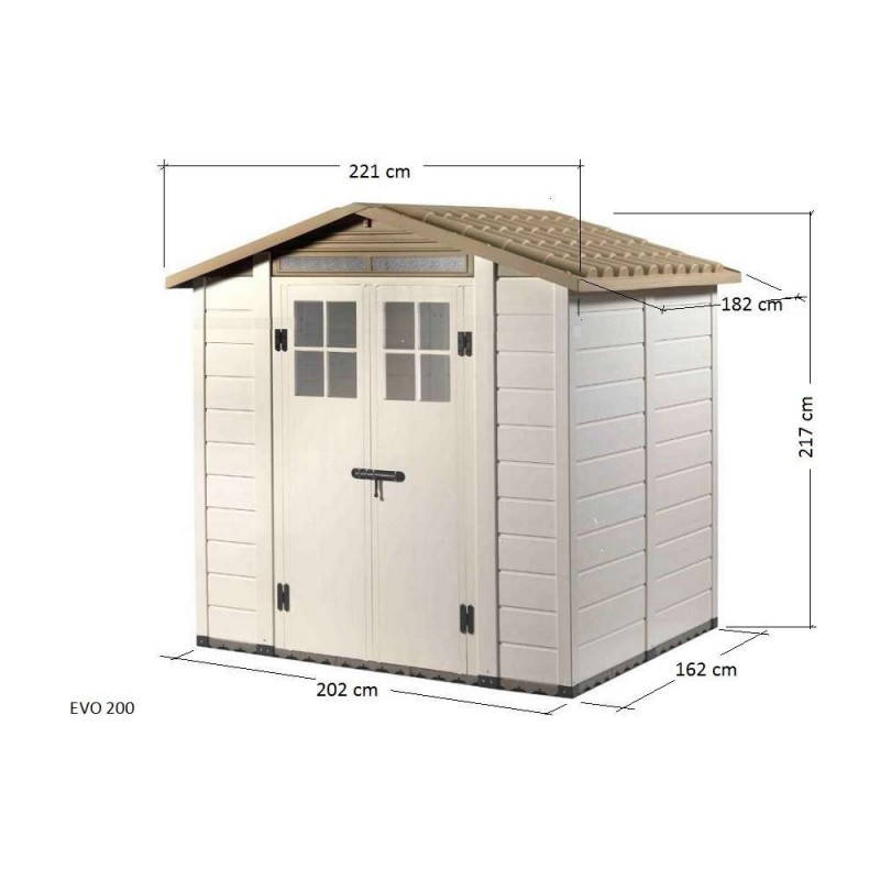 Equipped with hollow 22mm thick PVC walls, 2 glass doors with metal lock, this garden shed with composite wood slab floor, and an ABS roof treated anti-UV with 2 slopes imitation tiles, is from the Evo range in beige colors.