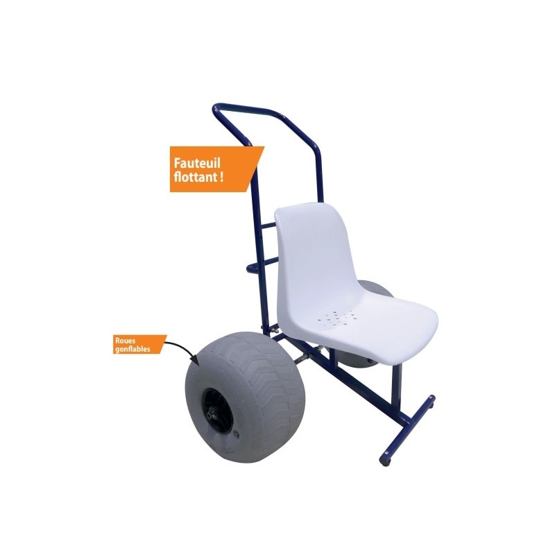 Sillón Hexagone Unik para lanzar a personas con movilidad reducida. Está equipado con 2 ruedas inflables, un reposapiés delantero telescópico y un cómodo ancho de respaldo.