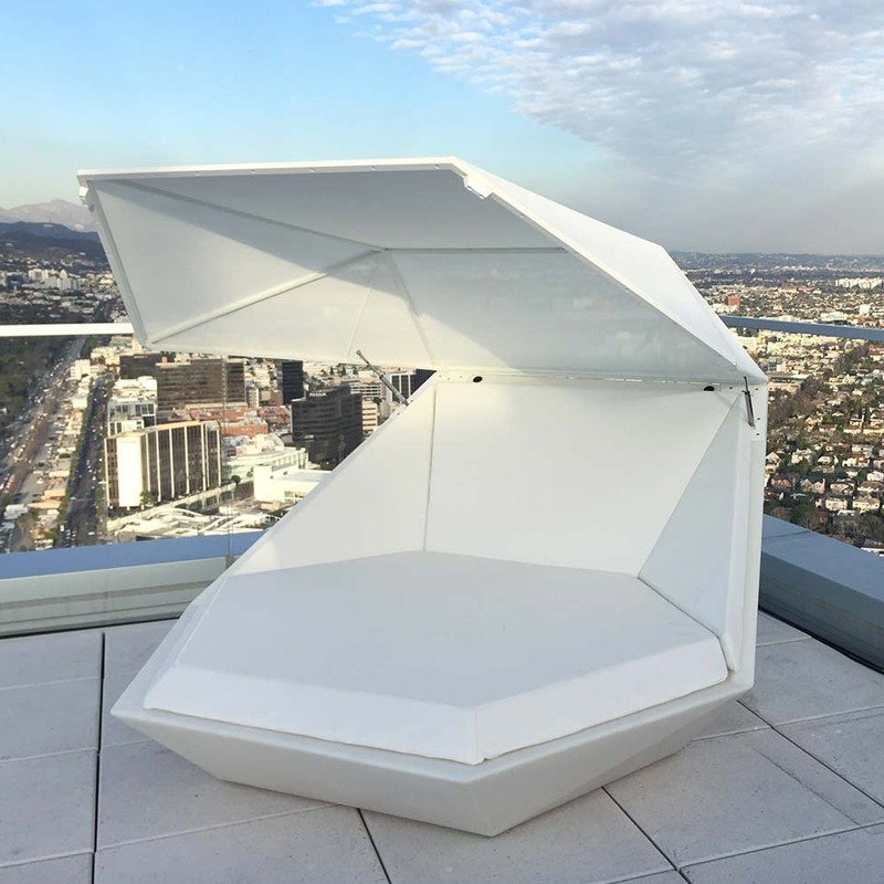 Más que una hamaca, la tumbona Faz es un objeto de diseño real a las formas únicas y originales que le darán un toque especial a tu bar, restaurante u hotel. Giratorio de 360 grados, esta silla de diseño serán fácil de seguir los rayos del sol mientras que siendo protegido por el paraguas. Este pabellón de protección abre y cierra según la intensidad del sol y la cantidad de sombra que desee.