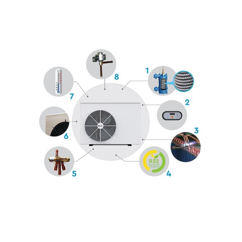 Los controladores de alta y baja presión, el interruptor de flujo de agua, el sistema de descongelación de inversión de ciclo y los sensores de temperatura 5 están controlados por un regulador digital que proporciona una protección óptima de la bomba de calor y un control preciso de la temperatura de la piscina.