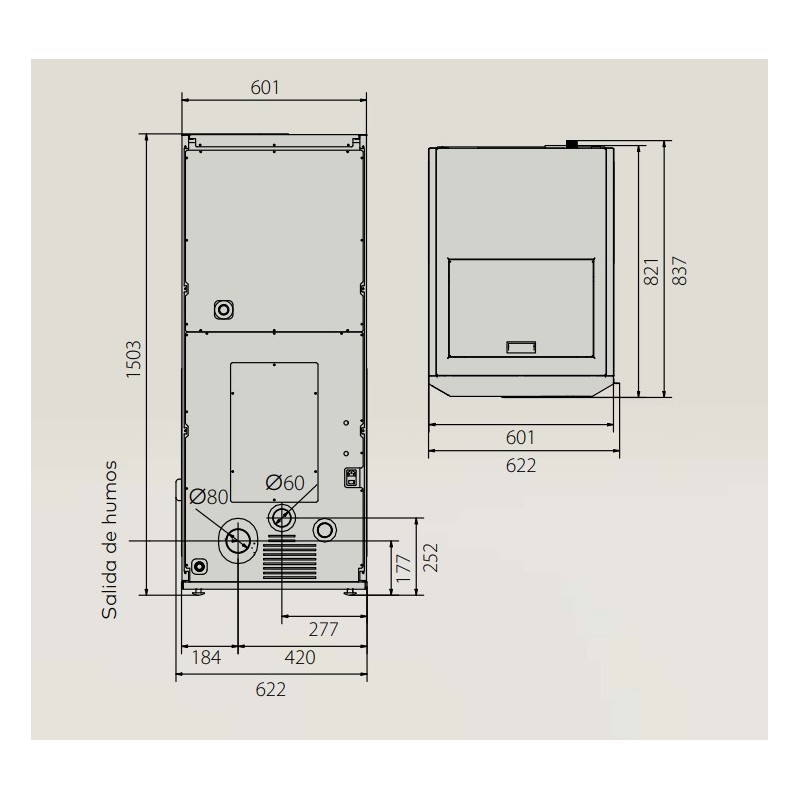 Salida de humos en 80mm, debe estar conectado a conductos de 100mm mínimo