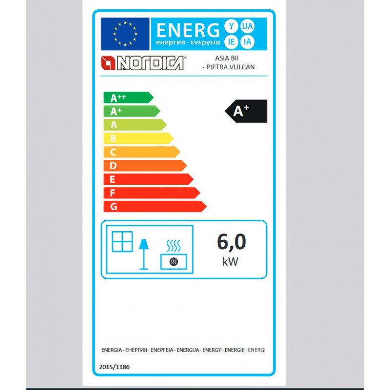 La estufa de leña Asia BII  La Nórdica con una potencia entre 6 y 7,4 kW. Esta estufa de leña tiene un revestimiento de piedra y una potencia quemada de 7,4 kW. Calentará un volumen de unos 172 m3. Se adapta perfectamente a cualquier espacio. Su piedra vulcana, permite acumular calor y restaurarlo durante un largo período incluso después de que se extingue el fuego.