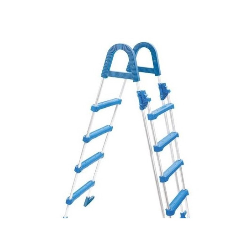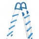 Escalera: Escala de seguridad. Está fabricada en acero galvanizado y lacada en blanco con 6 escalones y frente desmontable. (Esto permite desmontar los escalones en el lado exterior para evitar que los niños accedan a la piscina y evitar accidentes).