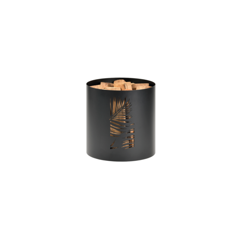 Avec son motif de feuilles de palmier ciselées, le range-bûches Borneo s’affirme comme un objet déco à part entière à proximité du poêle.