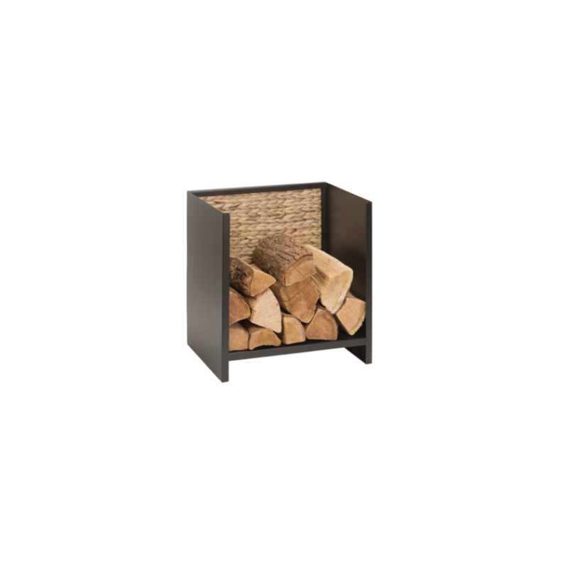 Rangement à bois d’intérieur qui associe deux matières : sa structure en acier et le fond en jacinthe d’eau.