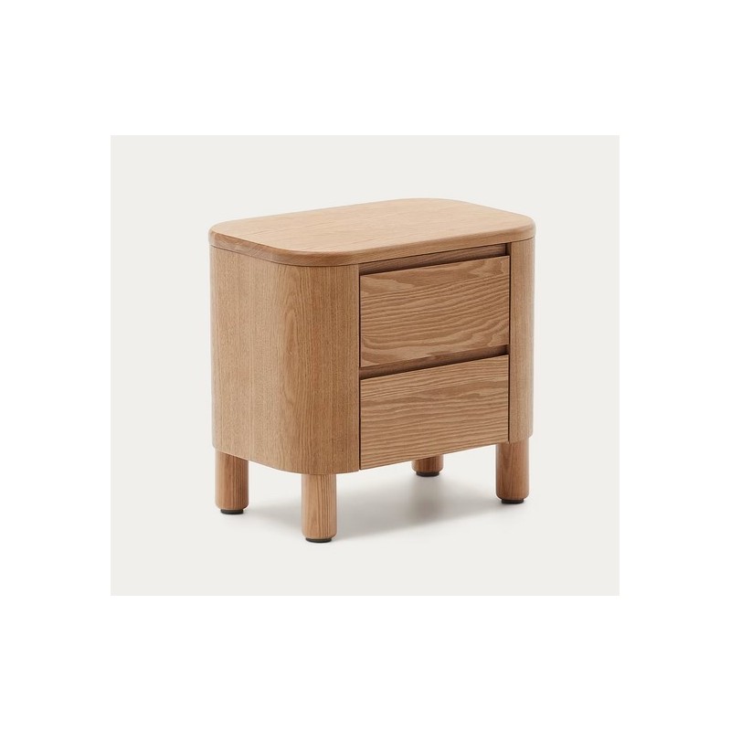 Table de nuit Saly en contreplaqué de frêne FSC et pieds en massif de frêne avec finition naturelle et tiroirs.