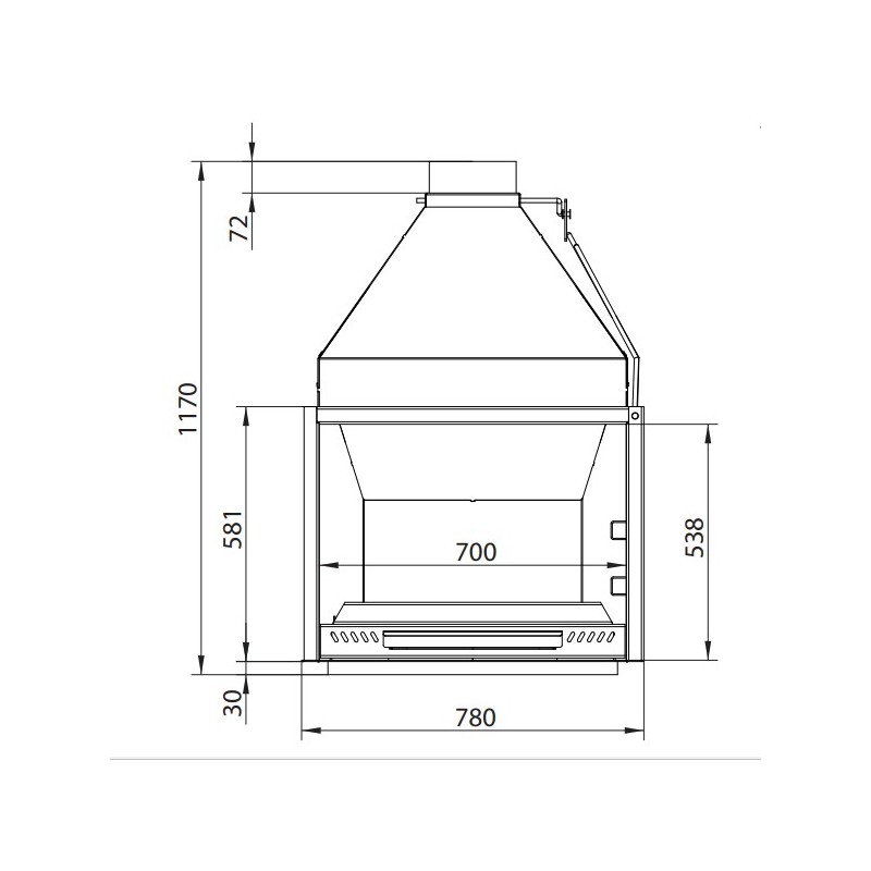 Il camino-barbecue da incasso Ferlux S70 di 70cm senza porta è realizzato in acciaio al carbonio da 4mm con griglia in ghisa, il posacenere è removibile.