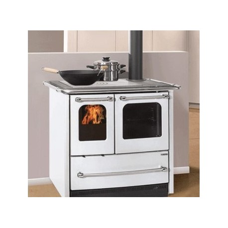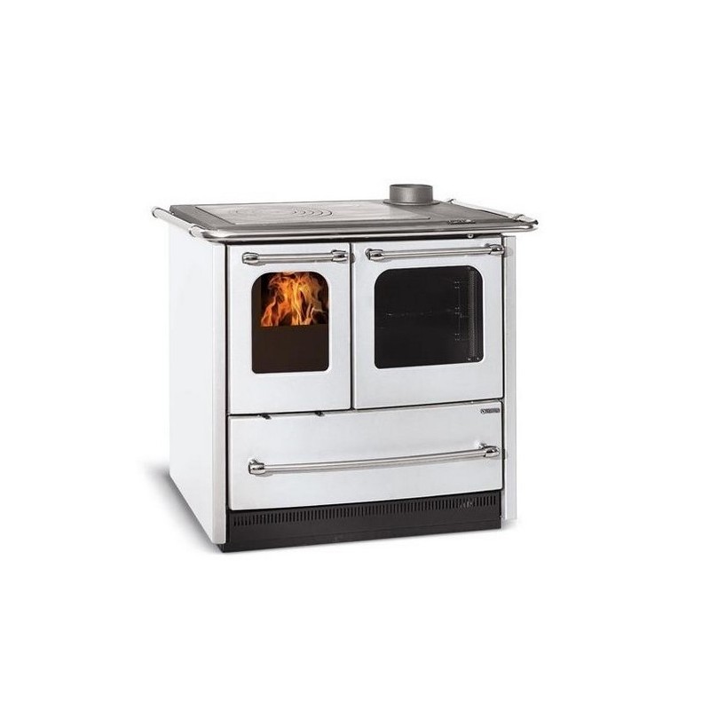La stufa a legna Sovrana Easy Evo con forno da 41 litri del marchio La Nordica è realizzata in ghisa smaltata bianca. Con una potenza nominale di 7,2 kW che può riscaldare circa 215 m3.