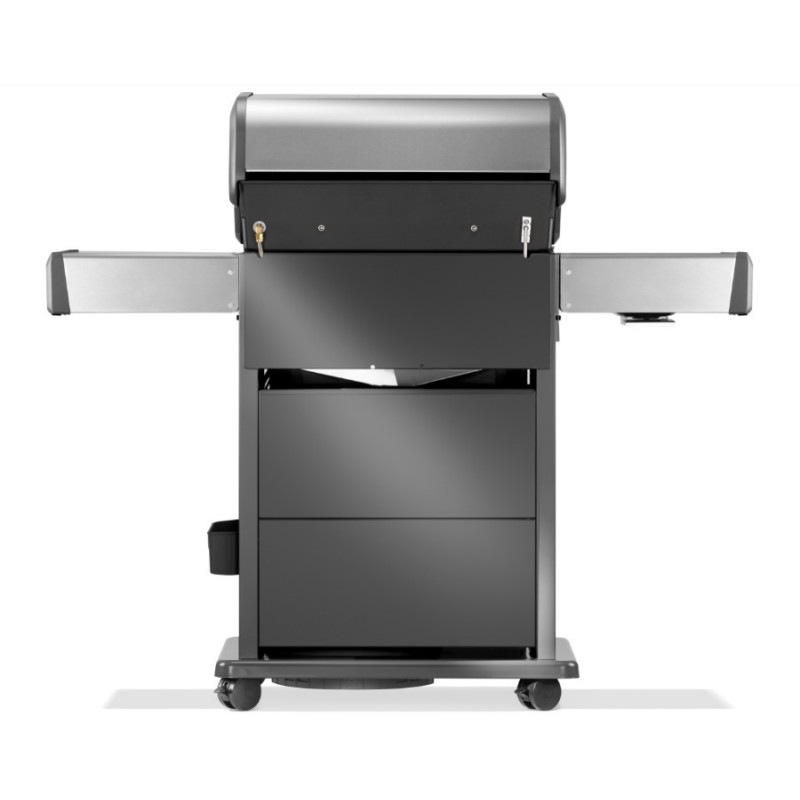I bruciatori sono in acciaio inox e la griglia è in ghisa smaltata. La ciotola del barbecue è realizzata in fusione di alluminioe il coperchio in Acciaio smaltato nero e frontale e ripiani in acciaio inox.