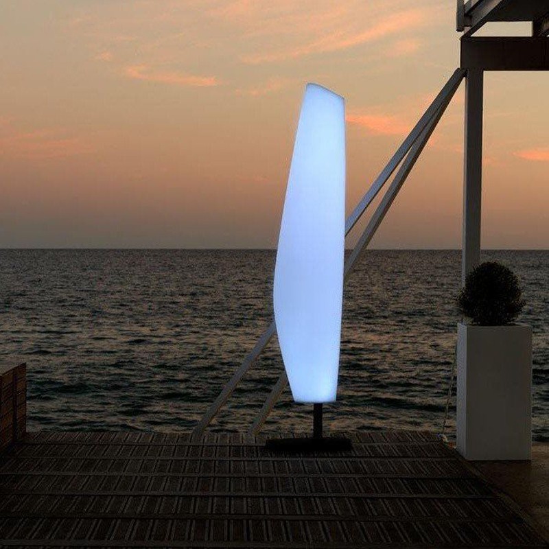 Dedicata agli esterni, la Blanca Outdoor - lampada (altezza 220 cm - larghezza 50 cm - profondità 45 cm) resistente alle intemperie da temperature estreme. Dalla testa ai piedi, egli assume la sua asimmetria: uno dei suoi lati seguendo una linea retta, mentre l'altro è gentilmente piegato; l'estremità superiore viene troncato mentre la sua parte inferiore si basa su un piede di metallo verniciato associato a base rettangolare con angoli arrotondati.