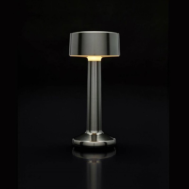 Walkman da esterno a LED ricaricabile della collezione Moment edita da Imagilights, composto da una struttura in alluminio ionizzato spazzolato e da un paralume cilindrico impreziosito da un diffusore in policarbonato opalino.