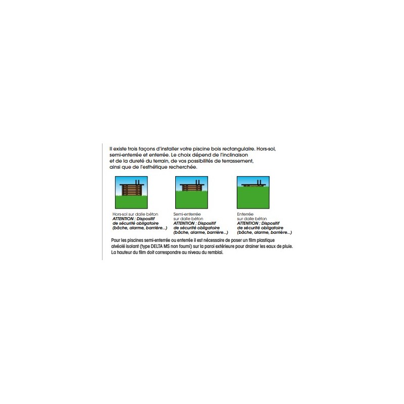 ATTENZIONE: Posizionare un foglio di polietilene ad alta densità (non in dotazione) sulla parete esterna per drenare l'acqua piovana. L'altezza del film deve corrispondere al livello dell'argine. Senza la presenza di una tovaglia drenante, la garanzia di 15 anni che copre la struttura in legno potrebbe non essere mantenuta dal produttore.