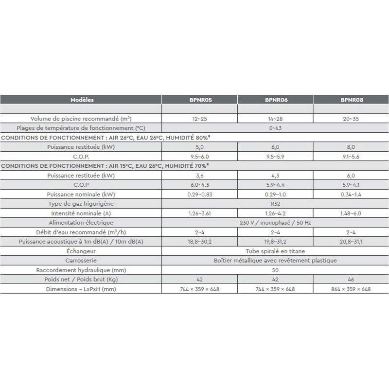 Die Wärmepumpe arbeitet mit Luft-Temperaturen von 0° bis 35 ° C (je nach Luftfeuchtigkeit) und ermöglicht die Verwendung von der Poolsaison verlängern. Inverter-Wärmepumpen ermöglichen auch in folgenden Betriebsbedingungen zu einem mittleren C.O.P 9: 26 ° c Luft, Wasser 26 ° c, Luftfeuchtigkeit 80 %.