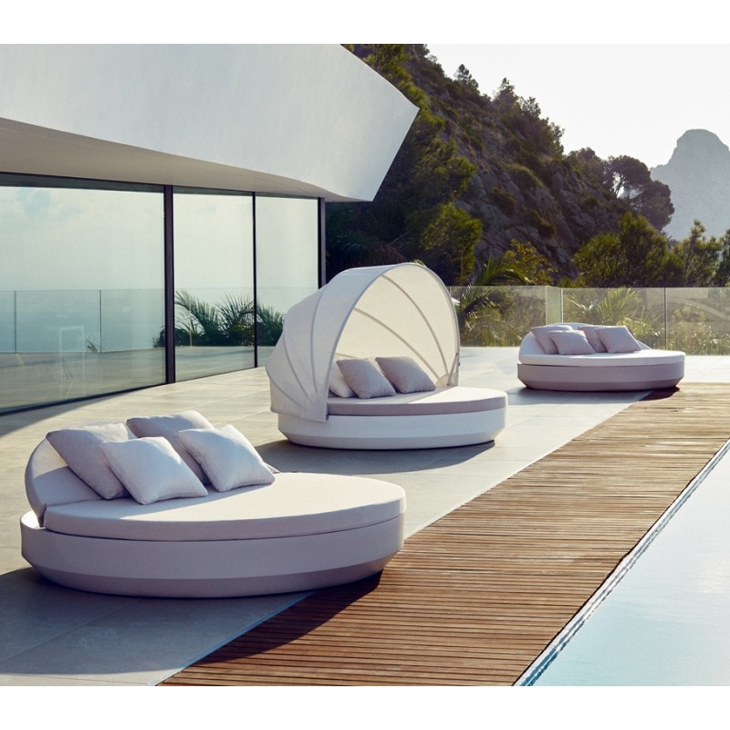 As almofadas que a compõem são feitas de tecido Náutico (couro de imitação) ou tecido Silvertex, em uma qualidade "náutica" muito bonita, usada em iates de luxo, muito resistentes ao UV, sal e mau tempo. Feita de polietileno, a estrutura do vela daybed design redondo banho de sol é perfeitamente adequado para uso intensivo ao ar livre.