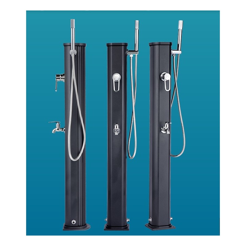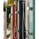 Prático, elegante e ecológico, Jolly Go em alumínio para um discreto chuveiro solar com capacidade de 20L com enxaguante para os pés, para o seu jardim ou piscina.